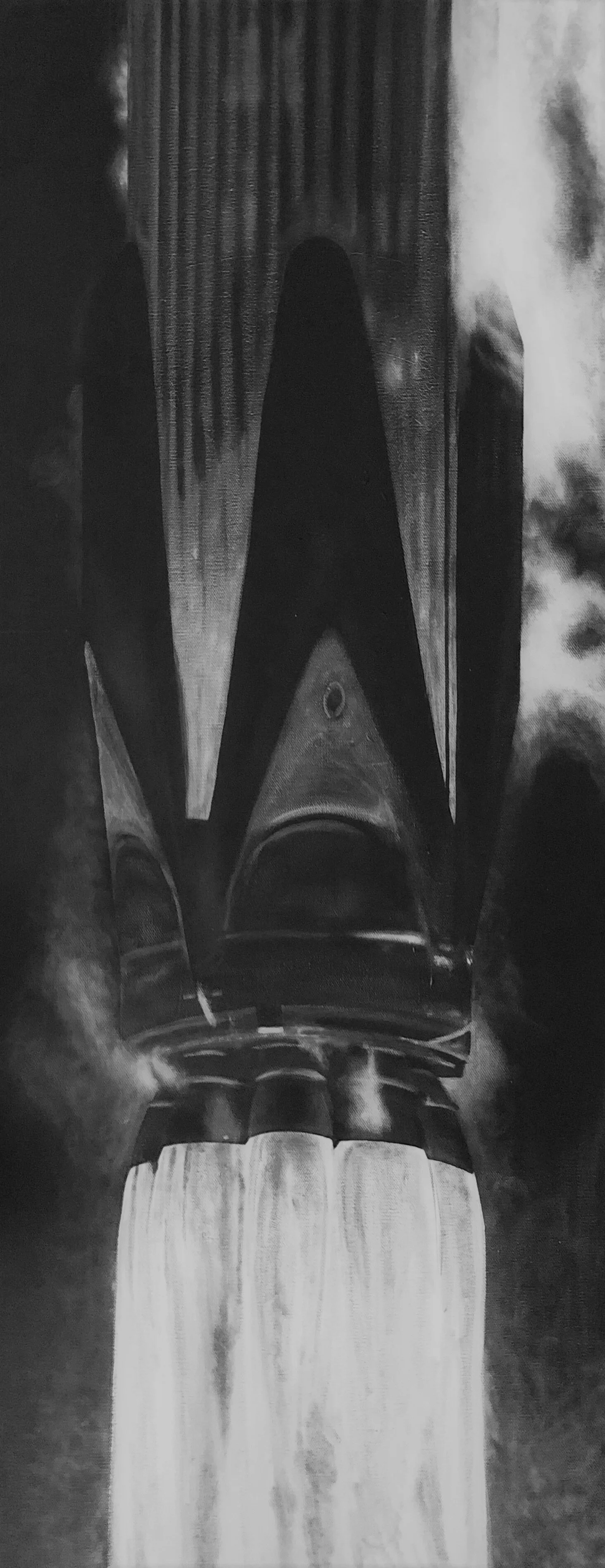 The power of lighting has never been more obvious. This painting was such a joy to complete because we got along so well. Everything flowed naturally despite this end result being a culmination of a few launch photos where I updated the hardware to represent the Block 5 version of the rocket instead of my photo reference’s Block 4. Most of this painting is simply white paint on a black canvas where I utilized the dry brush technique to slowly work the paint into the tone I wanted. Happy to say this original stayed in the family and resides with my parents in my childhood home.